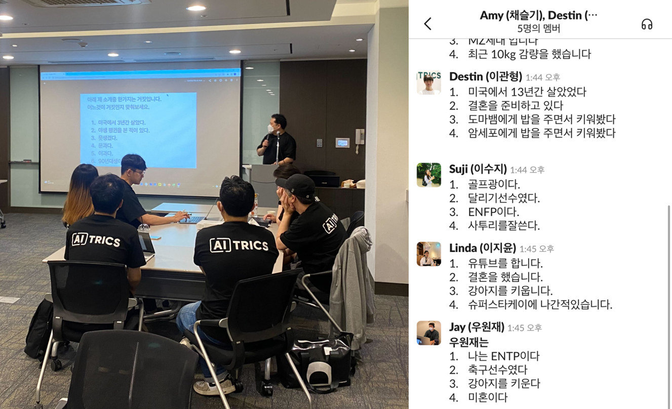 이번 워크샵에서 에이아이트릭스는 각 부문별 어떤 프로젝트들을 하고 있는지 공유하고, 회사에 일어난 새로운 변화에 대해 이야기하고 가장 중요한! 친목을 다지는 시간을 갖기로 하였습니다.