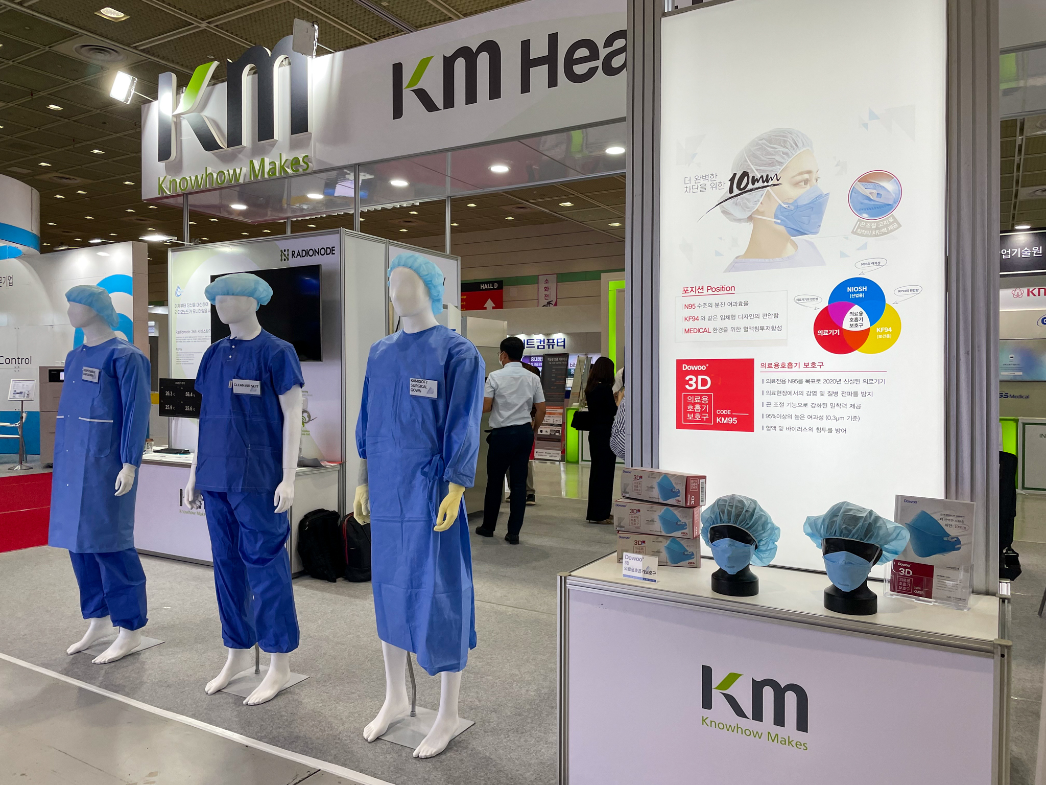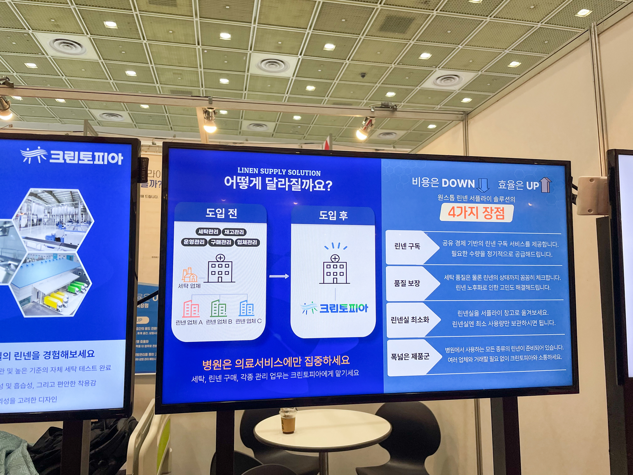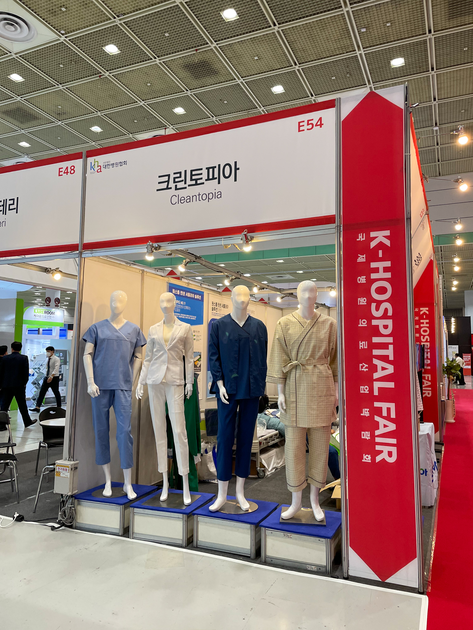 잠시 창업박람회에 온 듯한 기분을 느끼게 해준 부스가 있었어요. 바로 빨래방 프랜차이즈로 잘 알려진 크린토피아입니다. 몹시 호기심이 생겨 부스에 방문해보았는데요, 병원들과 계약을 맺고 의료복 및 환자복을 비롯해 침구류, 수술포 등 병원에서 사용하는 모든 린넨류의 전문 세탁을 담당한다고 해요. 의료복을 직접 디자인하기도 했다네요.