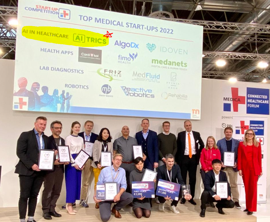 메디카는 올해로 11번째인 스타트업 컴피티션에서 AI in healthcare, Health apps, Lab Diagnostics, Robotics의 4가지 영역에서 각 3개 업체를 선정하였어요. 이렇게 TOP12 기업 중 AI in healthcare 영역에 에이아이트릭스가 AITRICS-VC(VitalCare, 바이탈케어)로 이름을 올렸습니다.