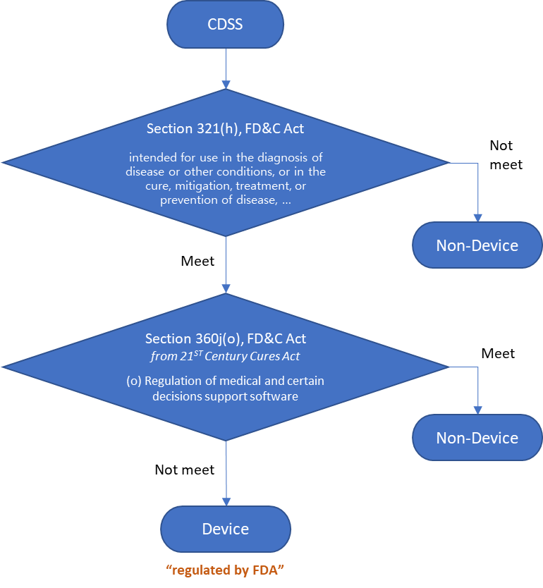 “의료기기” 범위에 해당되는 CDSS는 FDA(미국 식품의약국)로부터 규제에 따라 감시를 받게 됩니다. 따라서 CDSS를 개발하려는 업체에게는 CDSS가 제공하는 기능이 의료기기에 해당하는지를 판단하는 것이 중요한 활동 중 하나입니다.