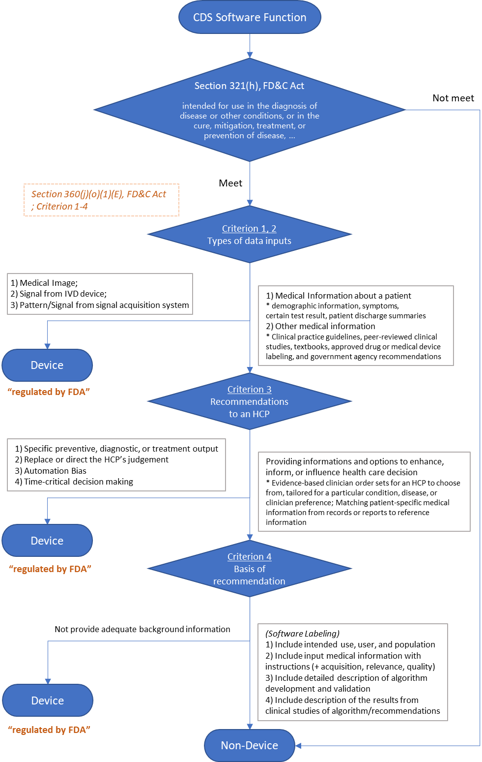 제품 기능의 사용목적이 '질병이나 상태에 대한 진단, 치료, 완화, 예방 등'을 위한 것이라면 (1)에 따라 의료기기에 해당되지만, (2)의 면제 조항을 만족하는 기능의 경우는 의료기기 범위에서 면제됩니다. 최종적으로 의료기기에 해당하는 기능을 사용하는 CDSS는 FDA의 규제를 적용 받게 됩니다.