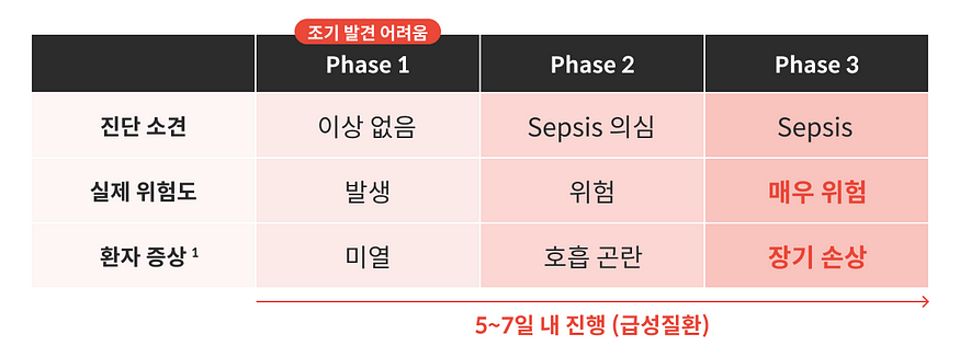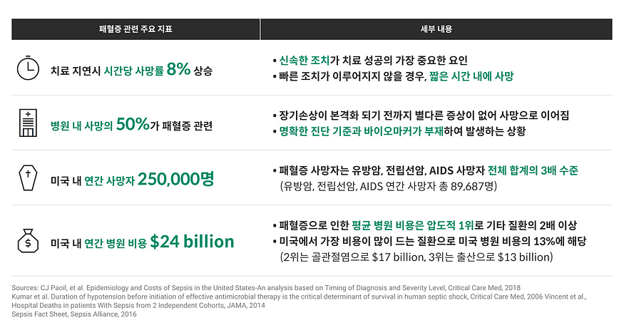 패혈증은 소리없는 암살자라고 불리며 실제로 병원내에서 환자들이 사망하는 원인 중 큰 비중을 차지하고 의료 비용 또한 매우 크지만 일반인들에게는 잘 알려져있지 않은 심각한 중증 상황입니다.