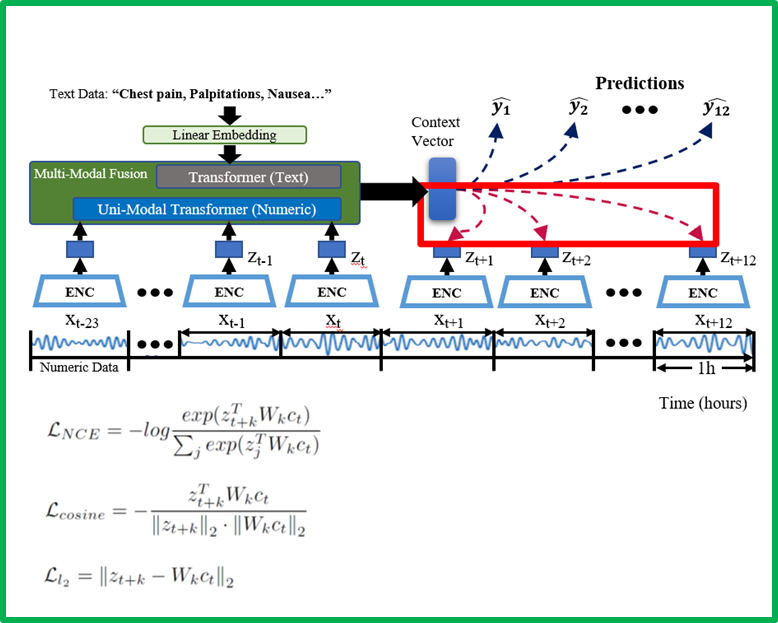 이 모델은 단순히 환자의 과거 생체신호만으로 환자의 상태를 예측하는 것이 아니라, 예측을 위한 학습 과정에서 Self-Supervised Regularizer(자가 미래 감독학습)과 Multi-modal(멀티모달) 학습방식을 사용하여 성능을 향상시켰습니다.