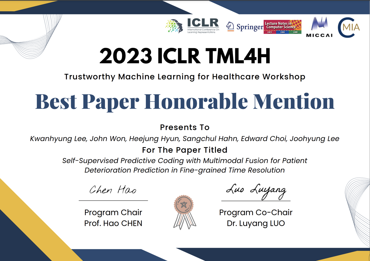 이번 수상 받은 논문명은 Self-Supervised Predictive Coding with Multimodal Fusion for Patient Deterioration Prediction in Fine-grained Time Resolution으로, ‘이전보다 더 정밀한 환자 악화 예측 모델 개발’에 대한 내용입니다.