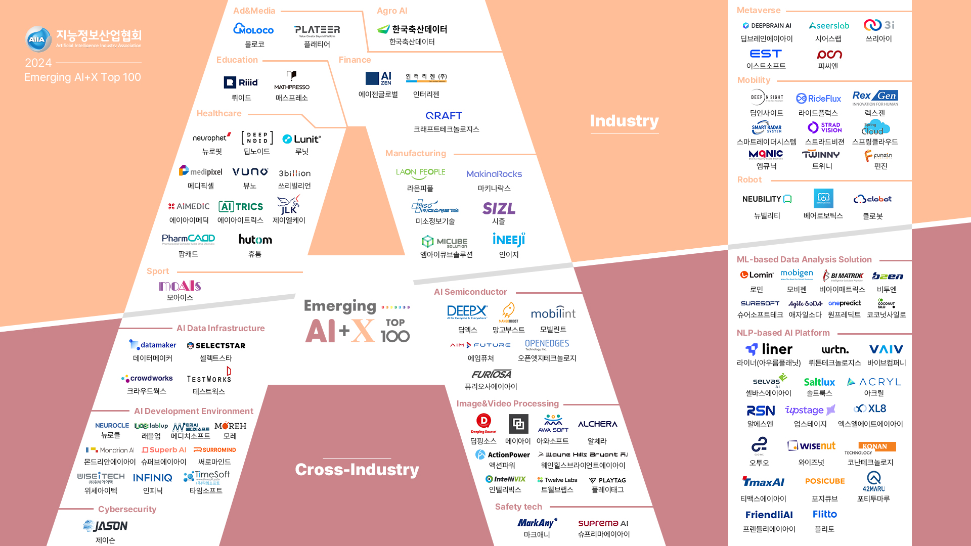 ‘Emerging AI+X Top 100’은 미래가치가 높은 Emerging(이머징)기업으로서 AI 기술을 바탕으로 다양한 산업(X)을 융합해 미래 혁신을 선도할 100대 국내 기업을 의미한다. 지능정보산업협회(AIIA)에 따르면, 올해는 약 2,010여 개의 후보 기업 대상으로 산·학·연 AI 전문가들이 기업의 기술과 사업의 미래가치를 집중적으로 평가했다.