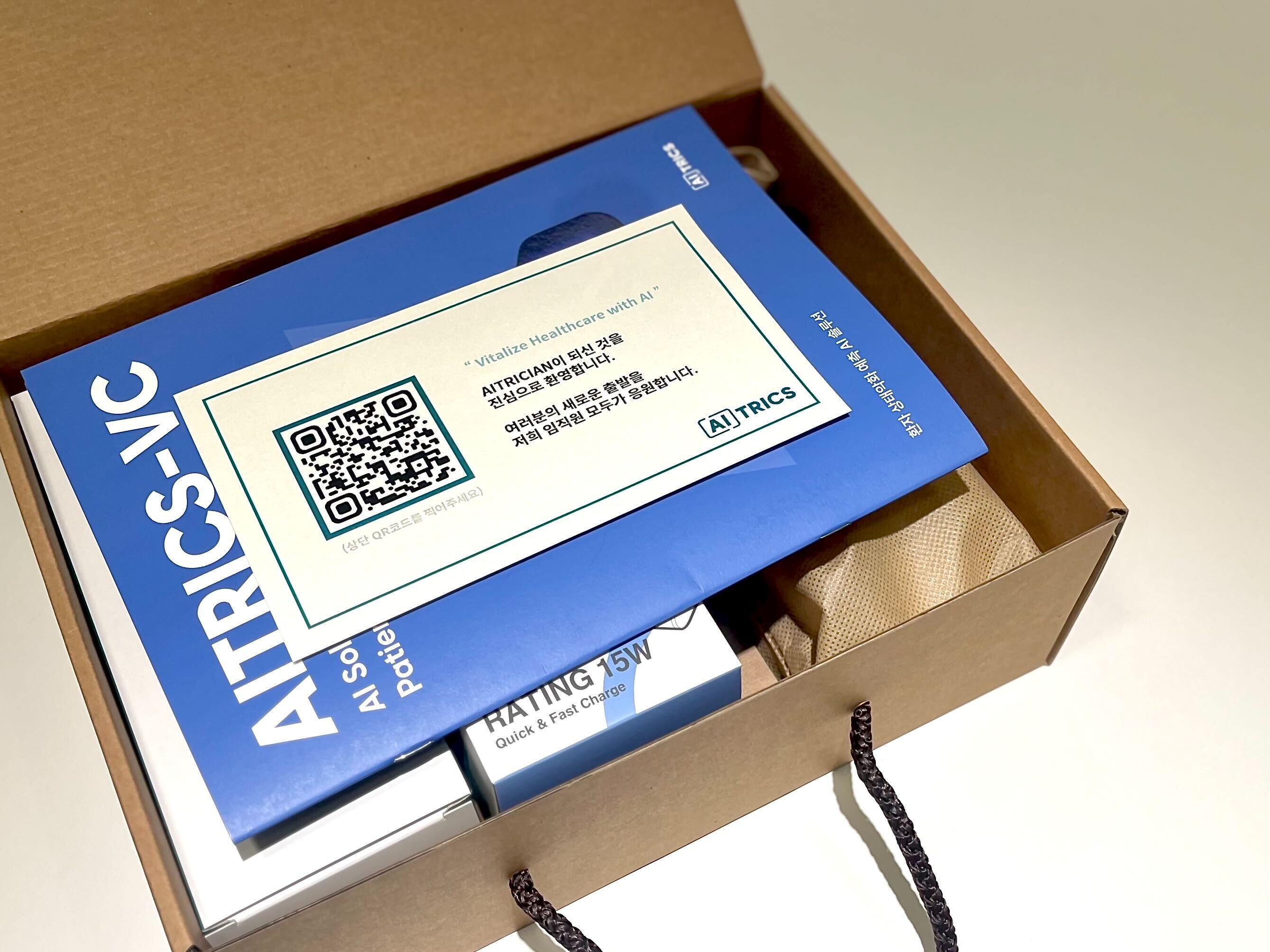 박스를 개봉하면 브로셔와 웰컴 레터가 제일 먼저 눈에 띄는데요. 우리 회사가 무슨 회사고 그동안 어떤 길을 걸어왔는지 알 수 있도록 바이탈케어 제품 브로셔를 추가하고, 앞으로의 여정을 함께할 New AITRICIAN🌟을 환영하는 마음으로 웰컴 레터를 준비했습니다.