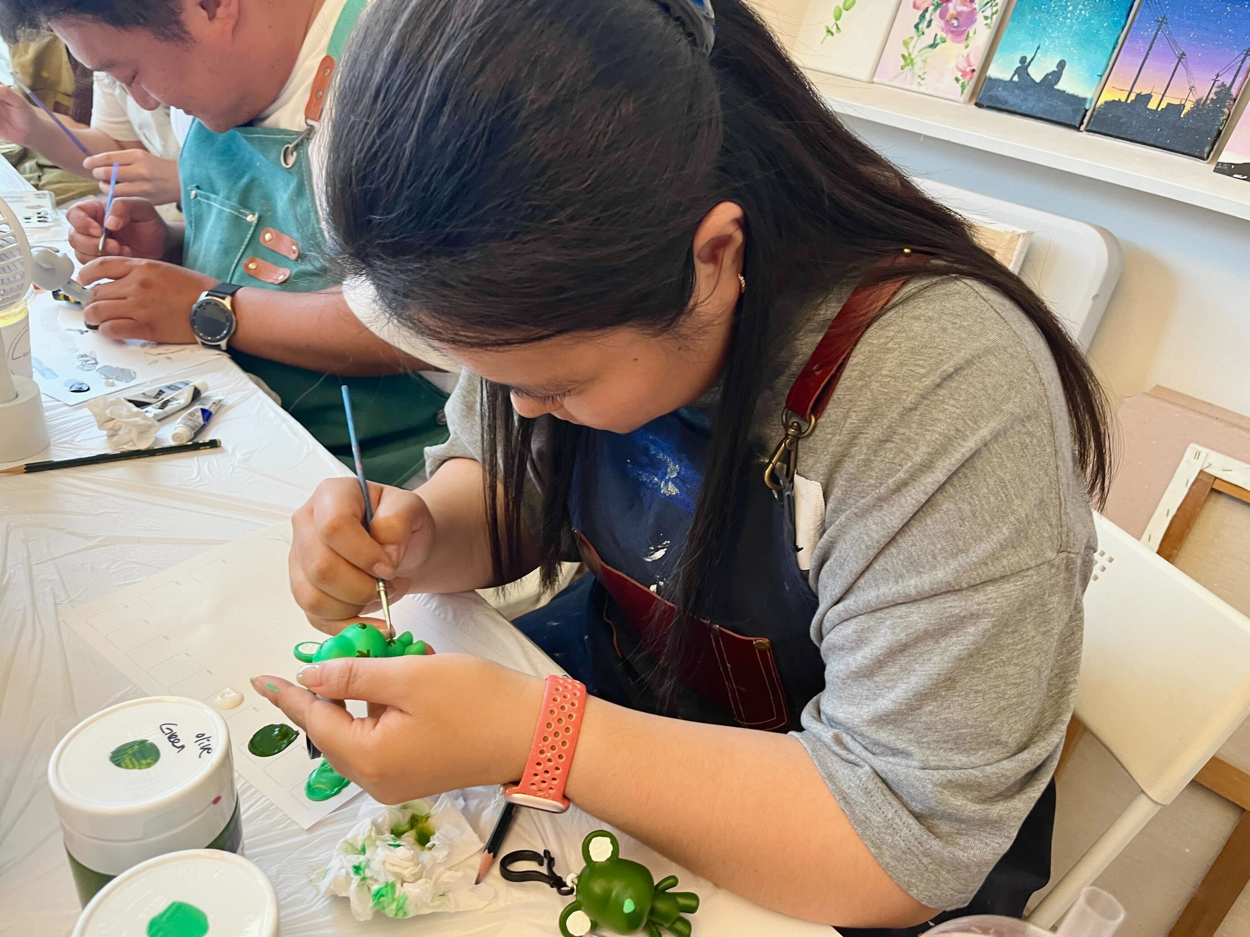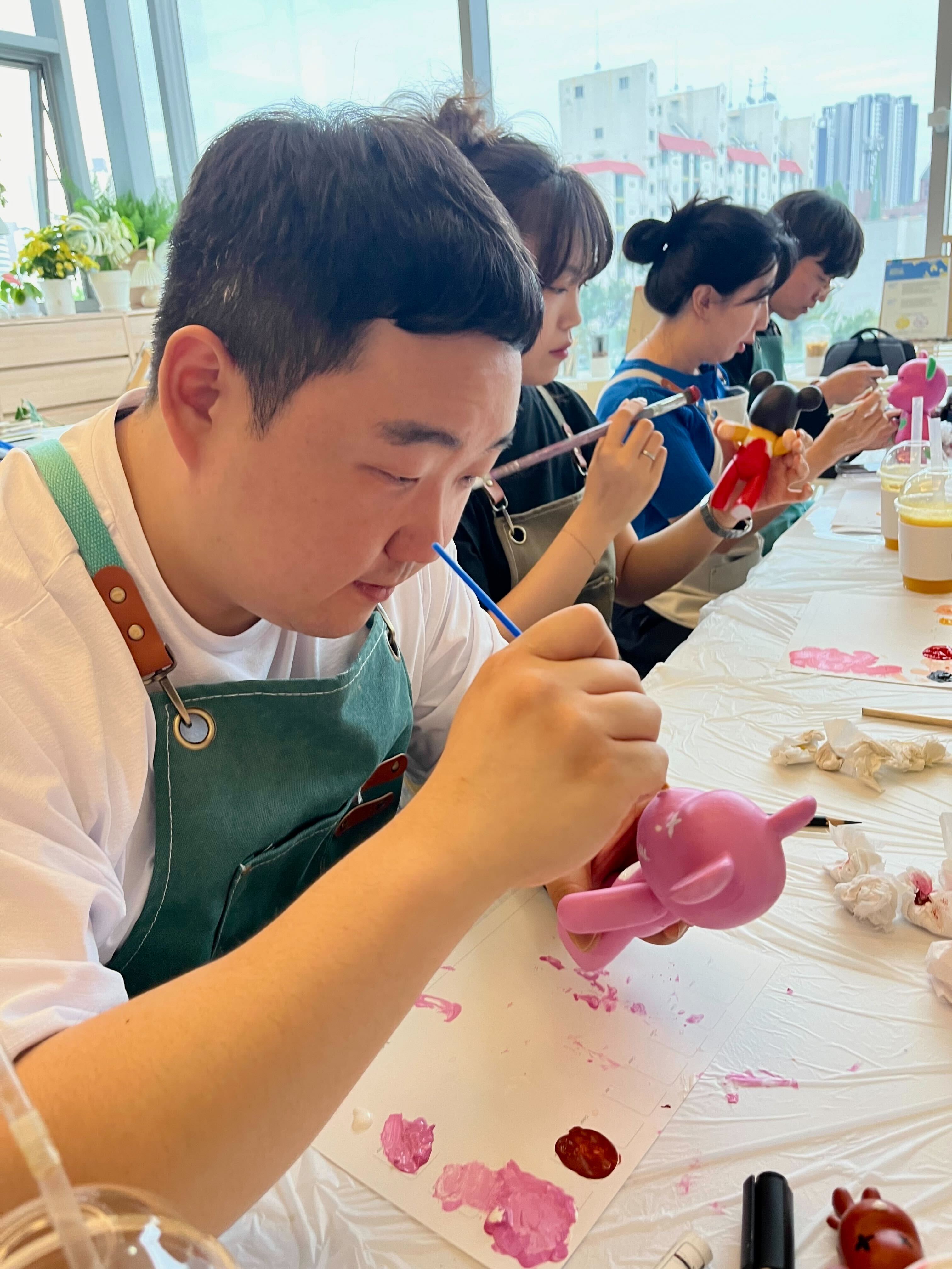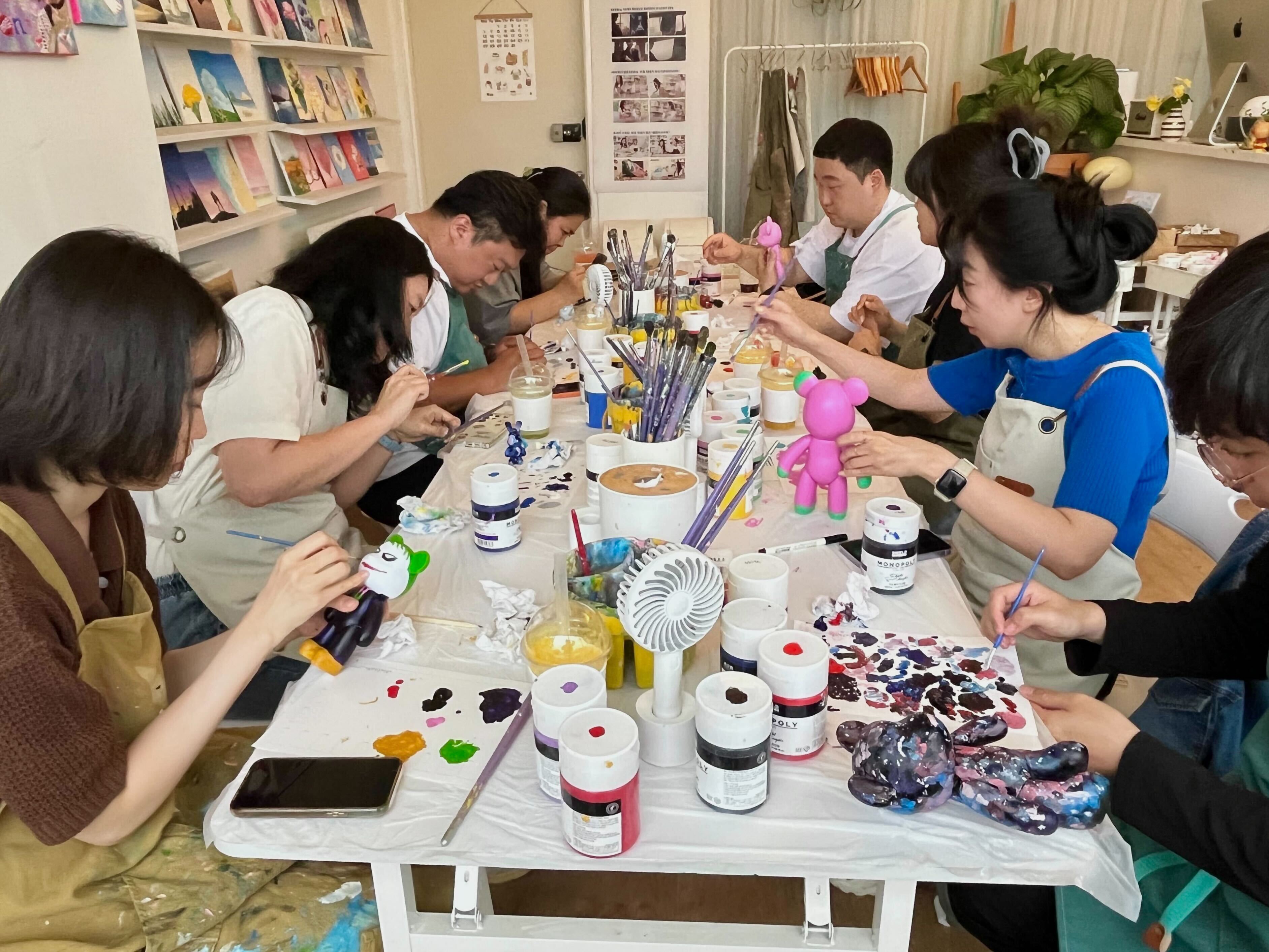 가장 먼저 첫번째 조는 아크릴 물감 페인팅🖌️ 클래스를 진행했습니다. 손재주가 없어도 알록달록한 물감으로 쉽게 나만의 베어브릭🐻을 만들 수 있는 기회였는데요. 선풍기로 말려가면서 최대한 붓칠 자국이 없도록 하는 게 포인트랍니다.👩🎨