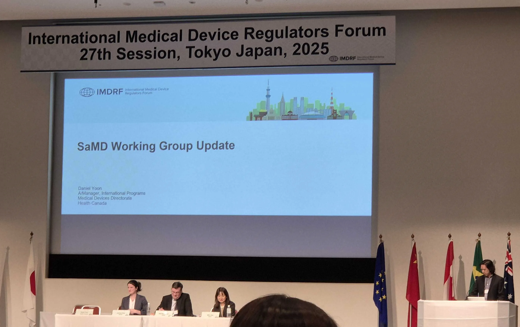 2일차에서는 IMDRF 회원국 및 주요 기관들의 최신 규제 동향이 발표되었습니다. Session 1: IMDRF Regulatory Updates를 통해 한국을 포함한 주요 국가의 최신 규제 개정 사항이 공유되었으며, 식품의약안전처(MFDS)도 디지털의료제품법(Digital Medical Products Act) 소개와 함께 IMDRF 지침 및 이외의 국제 표준과 연계하기 위한 규제 프레임워크를 제작해 공유하고, 위험 기반 규제 모델 개발에 대한 향후 계획을 전했습니다.