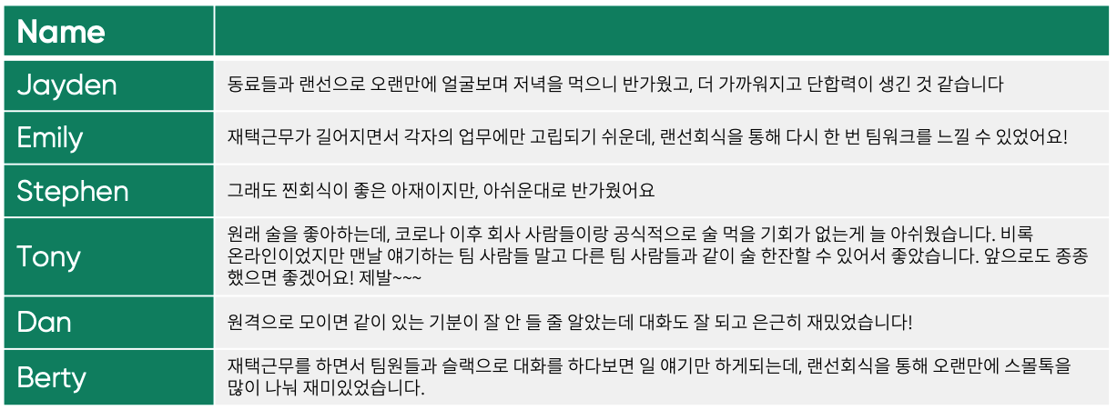 랜선회식에 대한 긍정적인 후기들도 많았는데요.